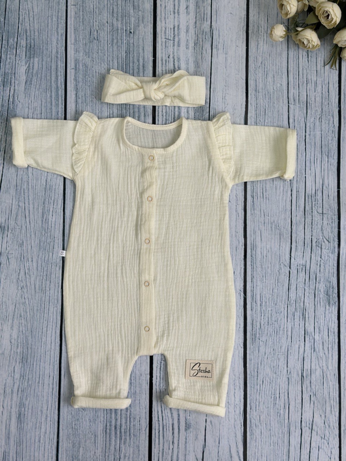 Купить оптом 336-СЛ. Комбинезон с повязкой для девочки из муслина, хлопок 100%, размеры 56,62,68, сливочный в Прокопьевске